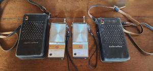 The radios appear to work but the volume control is scratchy. Both radios come with a protective case as seen in the pictures. When the cases are removed, I noticed that the speaker grills have been pushed in a little. I'll leave it to the new owner to pull them apart and push them back out. I laid a straight edge across them to give you a better idea.