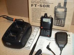 FOR SALE: Good looking Yaesu FT-50R dual band (144 and 440 MHz) HT. This radio has been tested and is working fine. This radio is in good condition, showing some wear, but no crack or breaks. Comes with box, manual, antenna, speaker/mic, NC-50 rapid charger, belt clip, and a battery that appears to be good.