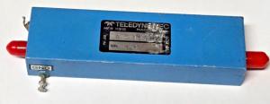 Teledyne 5-10Ghz radial amplifier 10db 20dBm. Works well from 5-18 GHz, not sure of exact power output, but it's pretty heavy for its size. Good linear response in its operating region. If I had to guess, this is a few watt amplifier, it had white heat transfer grease on the baseplate when I got it. 12VDC.