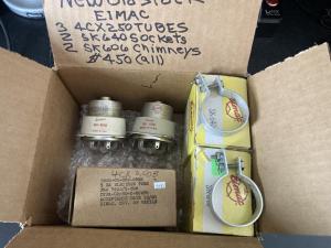 I BOUGHT THESE YEARS AGO TO BUILD A 6 METER AMP BUT GOT A GOOD DEAL ON A KING CONVERSION. ALL PARTS ARE NEW BUT THE BOXES WERE LOST FOR TUBES AND CHIMNEYS. THIRD TUBE IS STILL IN ORIGINAL BOX. $450.00 SHIPPED WILL ACCEPT PayPal you pay fee or POSTAL MONEY ORDER.