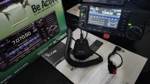 Comes with its original battery, mic, short power cord with Anderson Pole and original box. It has a red 3D printed kickstand for better view and USB-C upgraded board. I misplaced the English version manual, so what left is the French version of the manual. You can download the English version from Icom website.