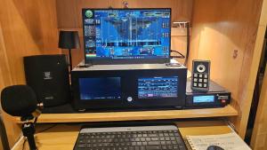 You can choose to run the radio from the internal computer, or plug the two network cables into your switch box and run it from your big computer if wish. Runs fine on the internal computer. I added the ability to run it within my network since I like to work digital modes. As you can see it will just fit inside a 19" rack mount on a shelf. Only flaw is a small scratch that is in the middle to the left screen, but hardly noticeable when the screen is lit up.
