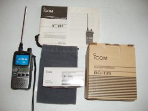 ICOM ICR3 receiver package. Included are the receiver, original antenna, carry bag and manual. Also included are a carry strap, the BC-135 desk top charger and CP-18A cigarette lighter cable. $125.00 shipped free CONUS.