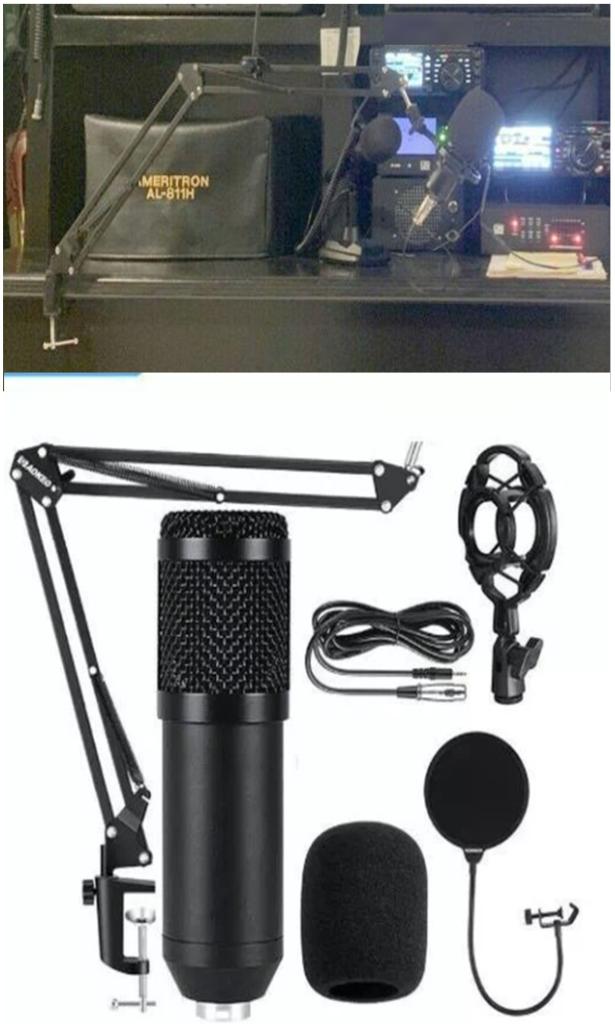 Comes with mic, 8ft of shielded mic cable (has PTT pigtail jack, PTT switch not included), scissor arm boom, mic holder, foam mic cover, anti-pop screen, desk clamp.