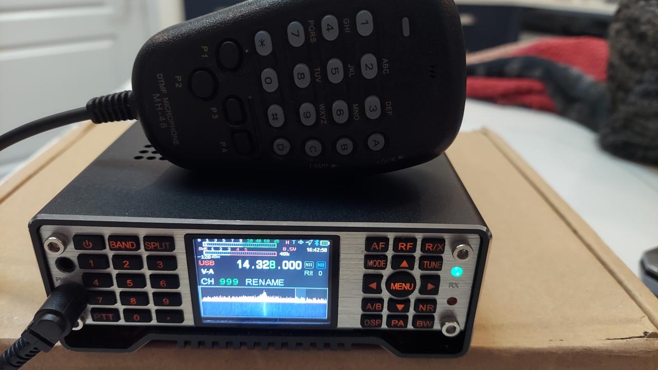 PRICE REDUCED I have a Guohetec Q900 version 4 all band, all mode transceiver for sale. This rig covers 160 through 70 cm. Modes include FT8, SSB, CW, AM, FM and RTTY. Receiver covers 300 Khz to over 1 Ghz. Runs about 20 watts 160 through 10 meters, about 10 watts on 6, 7 watts on 2 and about 4 watts on 440 Mhz. Built in digital noise reduction, antenna tuner, cw keyer, 4.9 AH battery, UTC clock, voltage display and many more features. Included is the pictured mic, original caring case and printed copy of the manual. The mic shown was included by the manufacturer, but only works as a mic. The keypad on the mic shown is not functional on this radio. Rig is in excellent condition. Asking $325. includes shipping to lower 48. PayPal preferred.