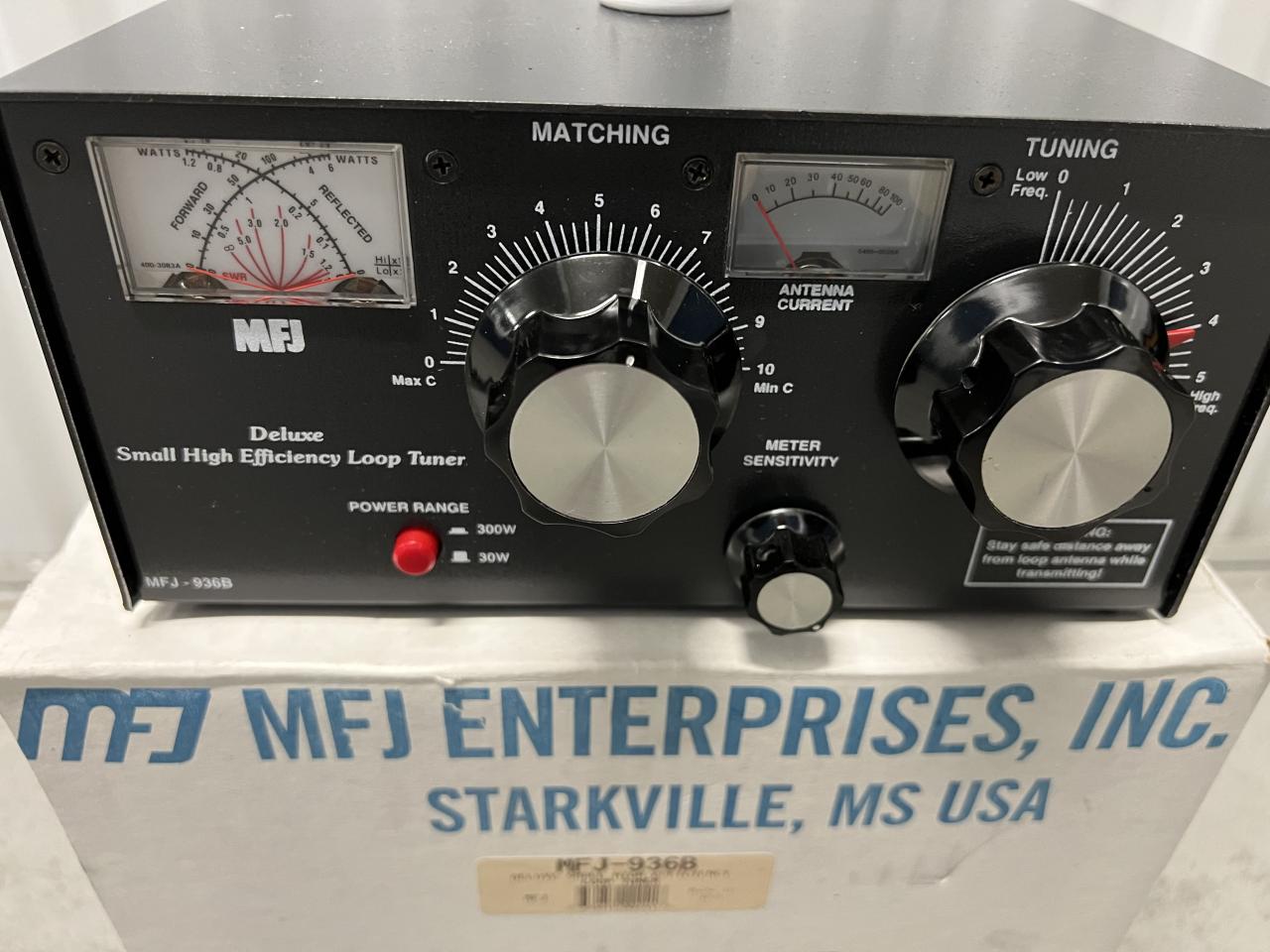 MFJ-936B Deluxe Small High Efficiency Loop Tuner, made by MFJ Enterprises, Starkville, MS USA. Designed for compact and portable HF loop antenna setups. Unit is in excellent cosmetic and working condition, clean front and rear panels, stored with care, and includes the original box.