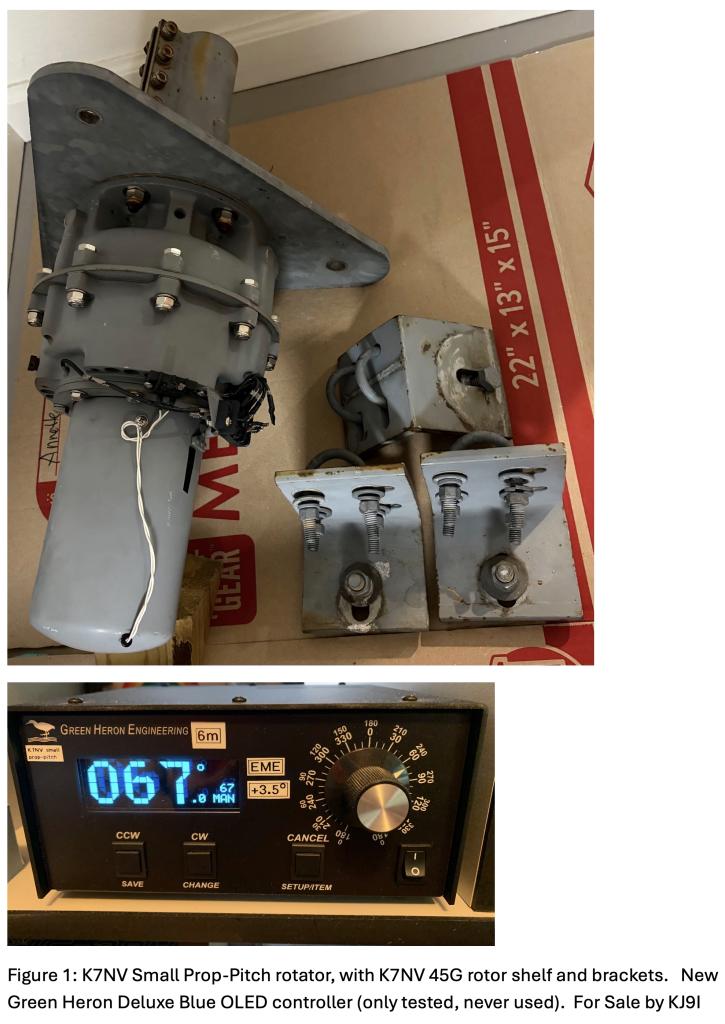 K7NV Small Prop-Pitch rotator with Green Heron Engineering Deluxe (black cabinet) Blue OLED (gorgeous) display Prop-Pitch rotor controller. Bought rotor new (refurbished) from the late K7NV Kurt Andress, Includes a Rohn 45G rotor plate for this rotor with the three clamps to affix rotor plate to tower legs. Plus also includes the rotor controller is new in box (never used) from Green Heron Engineering. Includes AC Data Systems Over-Voltage Protection modules for the rotor power and pulse-counting leads also. $3,500 for rotor and controller, rotor plate assembly (with brackets) and over-voltage protection modules. You ship or pickup in southeastern Wisconsin. Shipping is possible but expensive (at buyer cost).