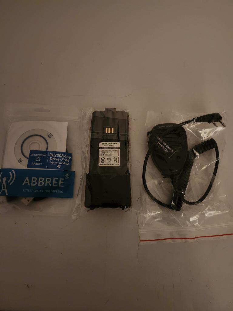I have for sale 3 Baofeng accessories I am selling as a package.  First is a brand new Baofeng Speaker mic, next is a brand new Abbree programming cable for Baofeng HTs.  It has the PL2303 chip in it, and comes with a mini CD, maybe drivers, or programming software.  I didn't open up the package to check on it.  Finally is a new Baofeng 3800mah extended life battery for the Baofeng BF-F8HP Pro, 5RM, AR-5RM, 5RM Plus, UV-5RM, UV-5G plus and UV-5RH series of radios.  Might work with some others.
