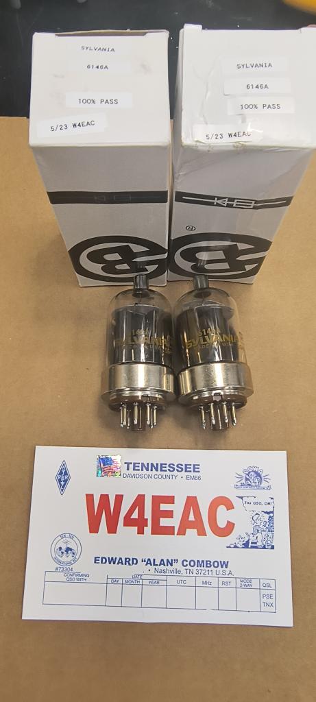 Sylvania/6146A RF Tubes.lot # AB. $75 + ground shipping. Questions text to the following.615 834 5996. Mutual conductance tested 100% good. With one hour burn in time on bench.73.Alan.