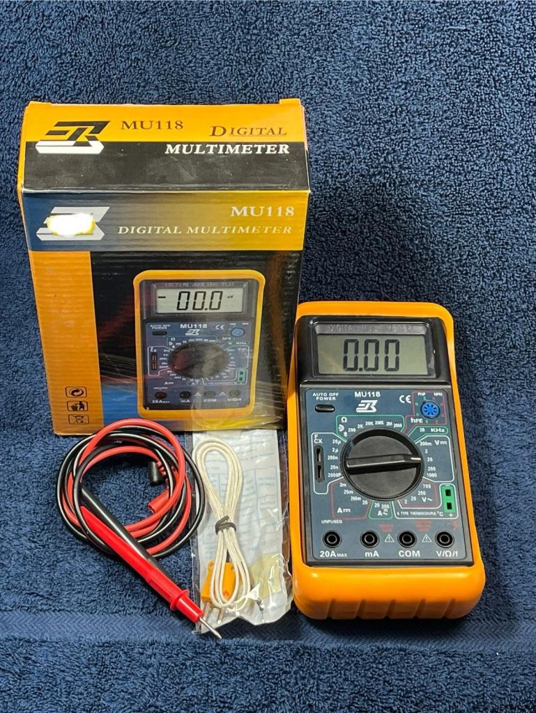 The MU118 deserves a spot in any toolbox. It measures AC voltage up to 700 volts, DC voltage up to 1,000 volts, AC current up to 200 milliamps, DC current up to 20 amps, capacitance from 20pf to 20uf, resistance from 10 ohms to 20 megohms, temperature from -84° to 400° C, and has an audible tester for continuity or diode testing. There is also a transistor socket for testing hFE of NPN or PNP transistors. Heavy duty test probes and a temperature probe are included.