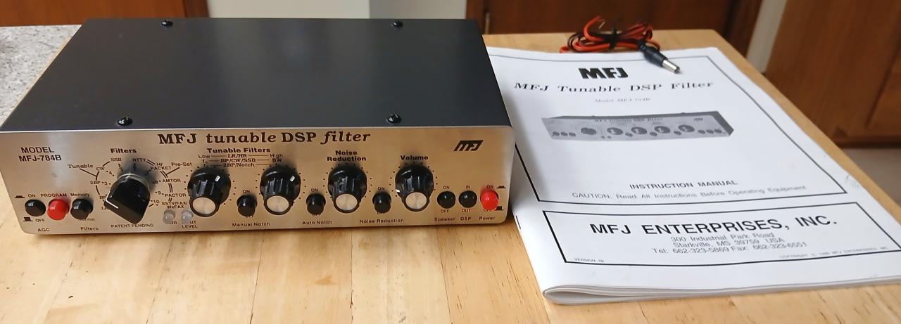 Like new condition MFJ-784B tunable DSP filter with original manual. Works well with radios not having auto notches, NR, SSB or CW filters.