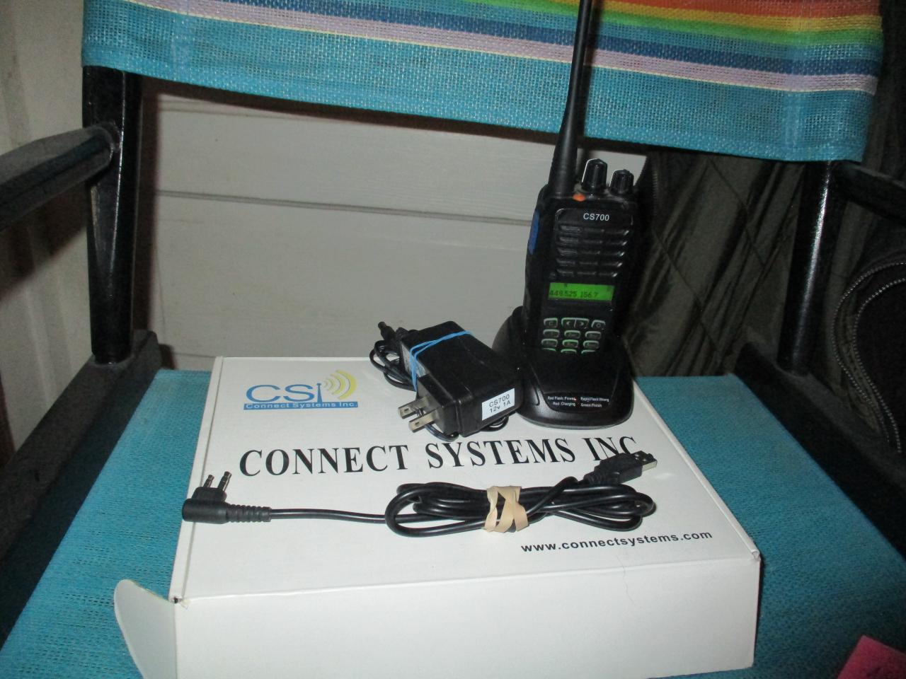 Complete kit including original box and manual. See https://www.connectsystems.com/amateur-software/CS700_software.html for programming software and firmware. Charger included, factory whip included or use your SMA adapter for car/truck.
