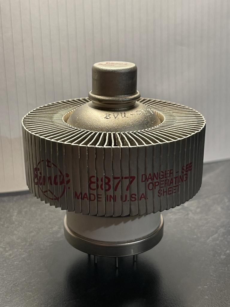 Eimac 8877 tube offered for sale. Tube tested in an AL 1500 at 2800v and 20mA drive for 1500w on 20 cw. Sold my Alpha 77 so tube is for sale. Tube was also tested at Richardson in Florida in 2022. Tested good in 5000v test fixture. $900 shipped in 48 states. Canada and DX will cost more to ship. Email me for addl pic and info. Pay pal FnF or check. Tube ships when payment clears.