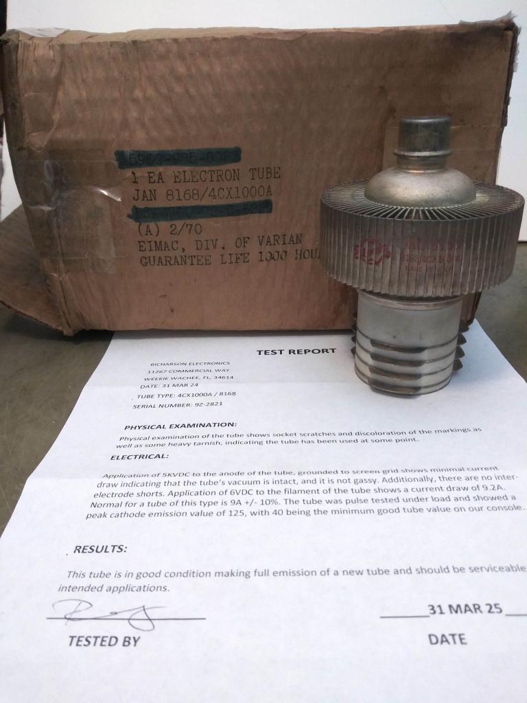 Up for sale is an Eimac 4CX1000A/Jan 8168. As far as I know this tube has never been used and the tarnish on the tube is from sitting unsealed for years. It was sent to Richardson Electronics for testing and meets all parameters for a new tube. It will come with a copy of the test data sheet and the original packaging, which is a bit shopworn. Asking $495.00 plus shipping, but will entertain reasonable offers.