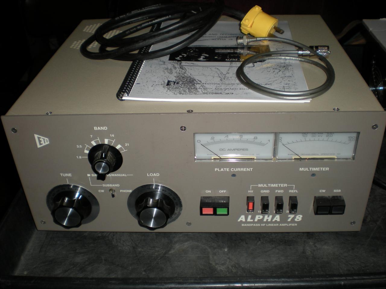 ALPHA 78 HF AMP. REMOVED FROM SK STATION SET-UP. NON-SMOKER. I WAS ABLE TO PLUG IN AND IT POWERS. UP NO OTHER TESTING WAS DONE. WIRED FOR 220. SELLING FOR SK's WIDOW.