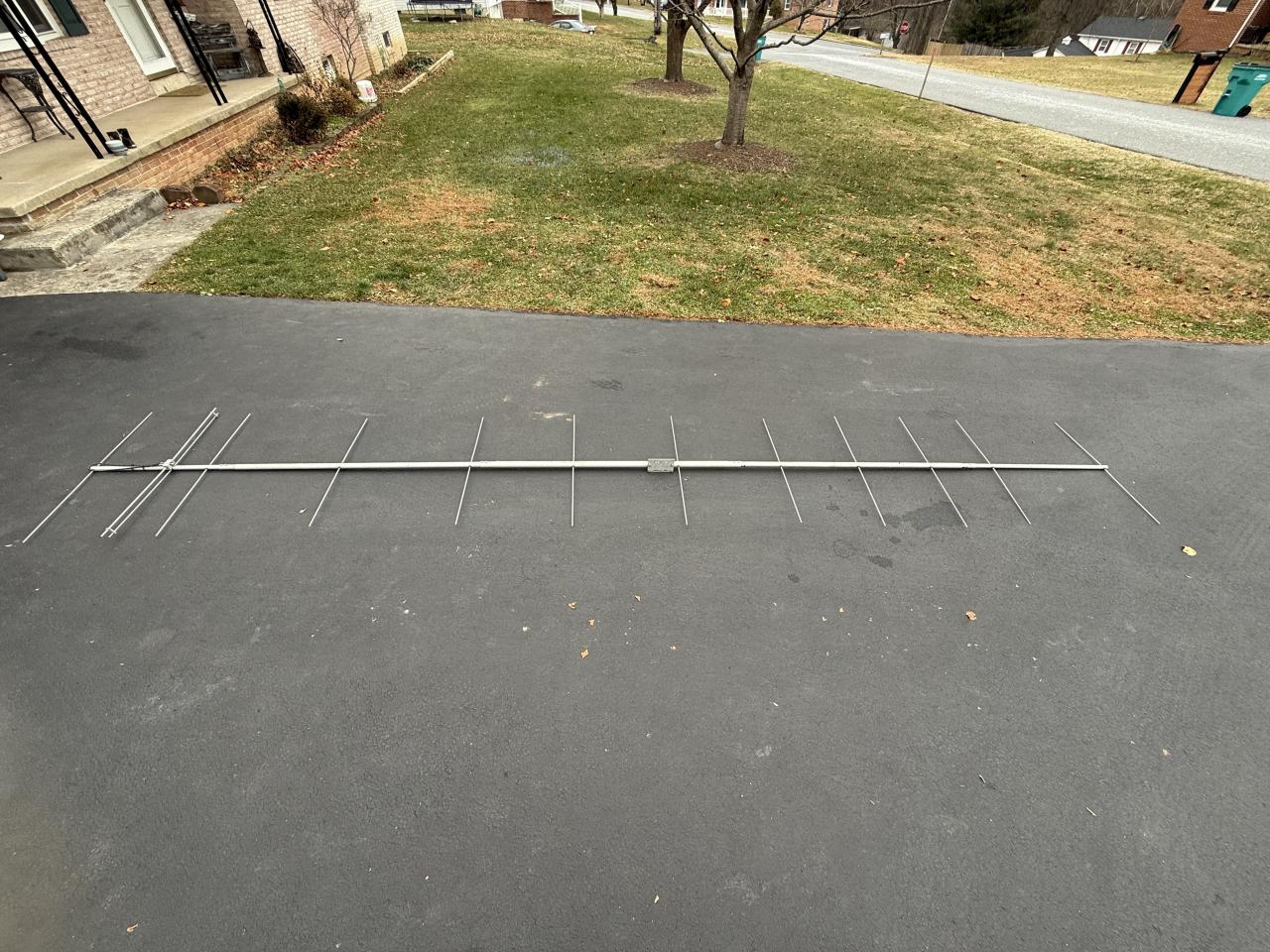 This is another antenna that we rescued from a ham radio estate a few weeks ago. All parts are there, and it has been reassembled on my driveway for this picture. It has 12 elements and is 19' 6"long (end to end). I will need to break it down for shipping, unless local pickup occurs (my preference).