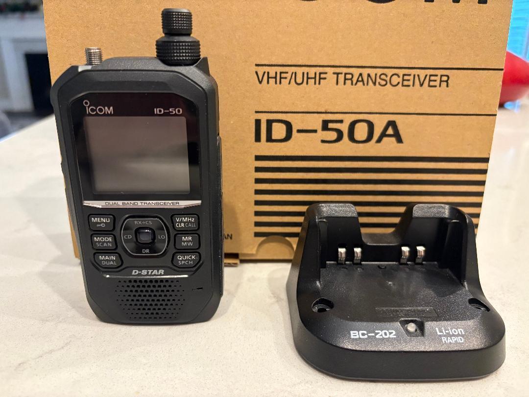 For sale Icom ID-50A. In like new condition. Less than 1 year old. Non smoker. Boxes, Manual etc that came with unit. Also incuded is the dest top Icom charger. Going price for both is $478.00. My price is $350.00 shipped to your home.