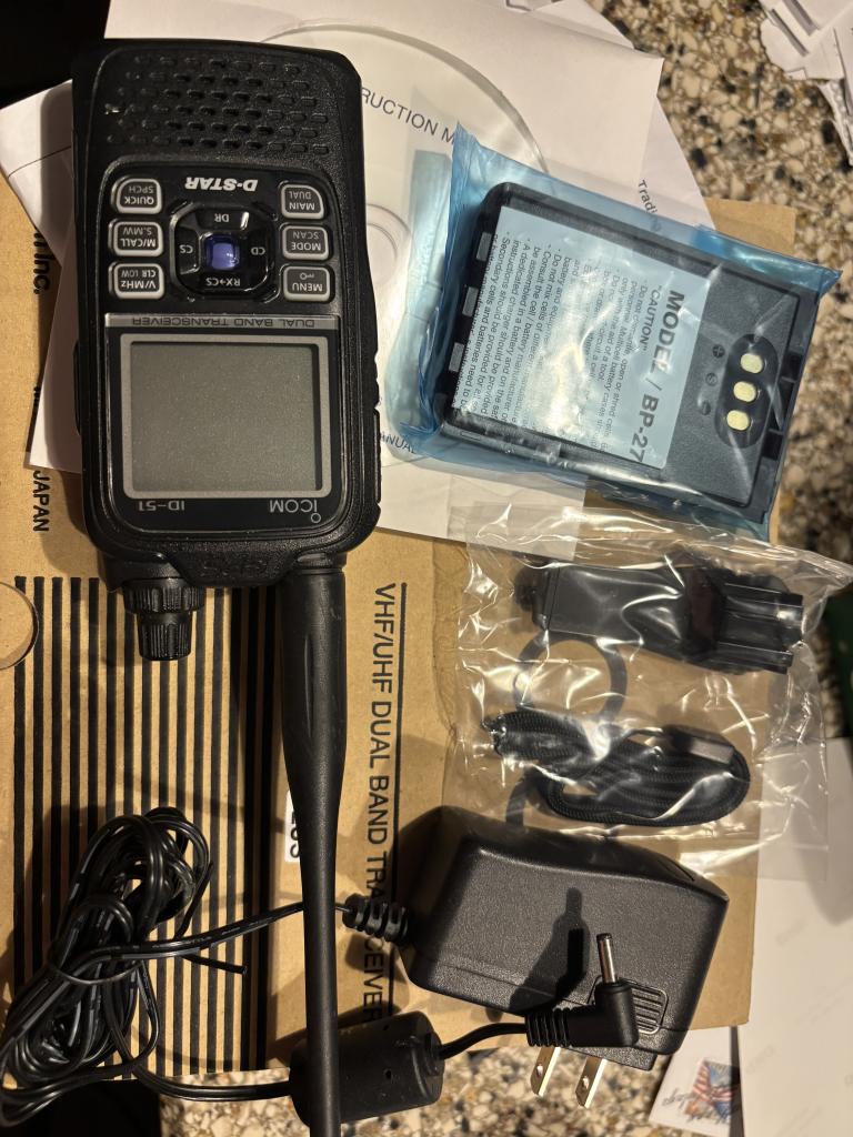 2/21/2026. For sale is a really clean ID 51 A+, selling due to upgrade to ID 52A+. I primarily use high capacity batteries so I just took the unused stock battery from the ID 52 I purchased and you will be getting that battery (new). So rest assured you’re getting a brand new stock battery for the ID 51A with belt clip and lanyard packet as well. The radio and wall transformer are the original purchased single owner. S/n 65001359. Also including Icom data communication cable OPC-2350LU. and can transfer license to you for RT Systems account and include programming cable. $325 shipped