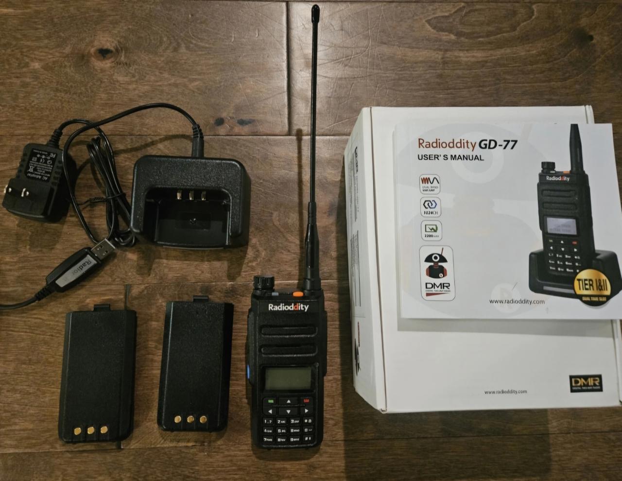 Radioddity GD77 handheld with dual band DMR. w/ Open GD77 software. Dual Band DMR. Includes charger, programming cable, two batteries.$110 shipped.