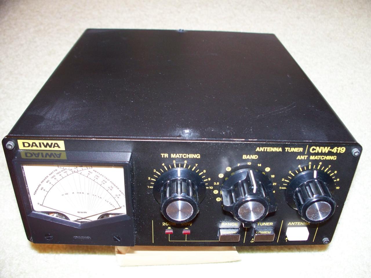 I have for sale a very nice Daiwa CNW-419 Antenna Tuner. This tuner covers from 1.8-30MHz with a power rating of 100W CW on 1.8-3.5MHz and 200W CW on 3.5-30MHz. It has 2 coaxial antenna outputs and a single wire antenna output. This unit has a cross-needle meter and the high quality construction Diawa items are noted for. It is in very good to excellent condition with no noticeable scratches. In the interest of full disclosure, there is a small chip on the red plastic knob on the rear-panel single wire output terminal. This knob screws off and can be easily replaced if desired. I have used this tuner in my shack and can certify that all functions work as required. Price is $225 including double-boxed shipping and insurance by FEDEX Ground. Payment by check or USPS Money Order (sorry I can't take credit card payments). I will include a copy of the downloaded manual. If any questions, please give me a call. Thanks for reading my ad! Gary, WB4DNL.