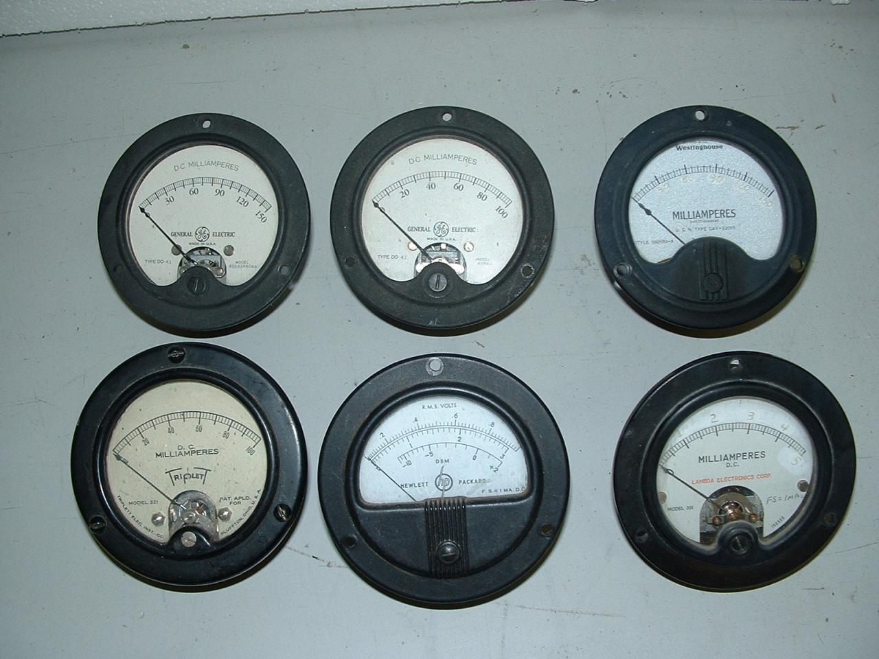 Offering for sale six (6) VINTAGE METERS. These are all 3.5 inch round DC meters with the following ranges:0-1 ma; 0-100 micro ampa; 0-100 ma, 0-150 ma; and 0-5 ma. The last two have had their scales altered to read as remarked. All these vintage meters for only $39.95 postpaid within the United States. I accept paypal, postal money order, cash, and checks (hold for clearance).