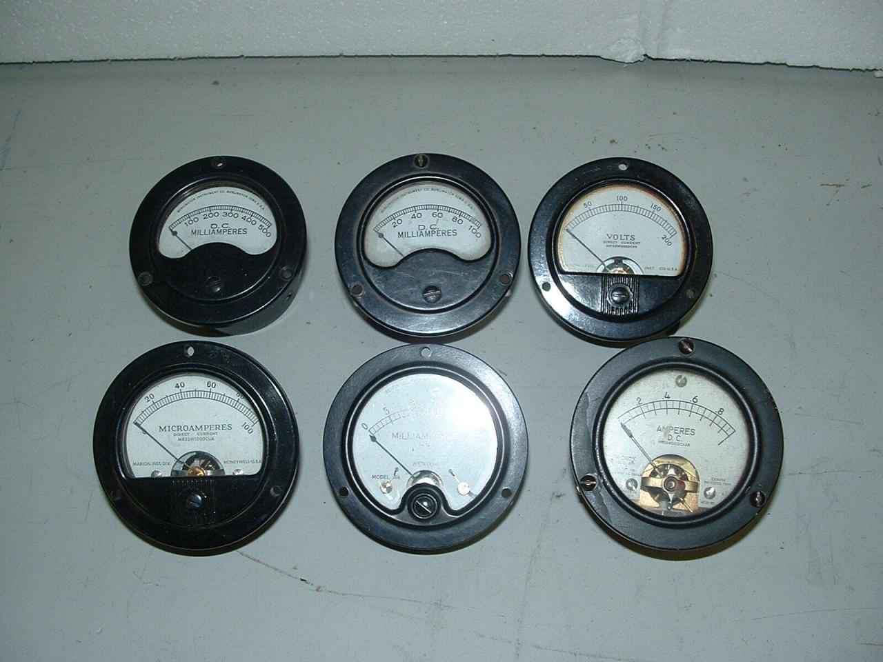 Offering for sale a lot of roughly 2.5 inch VINTAGE ROUND DC METERS with the following scales:100 micro amps; 25 ma; 100 ma; 500 ma; 1 amp; and 200 volts. All six of these nice vintage meters for only $39.95 postpaid within the United States. I accept paypal, postal money orders, cash, and checks (hold for clearance).