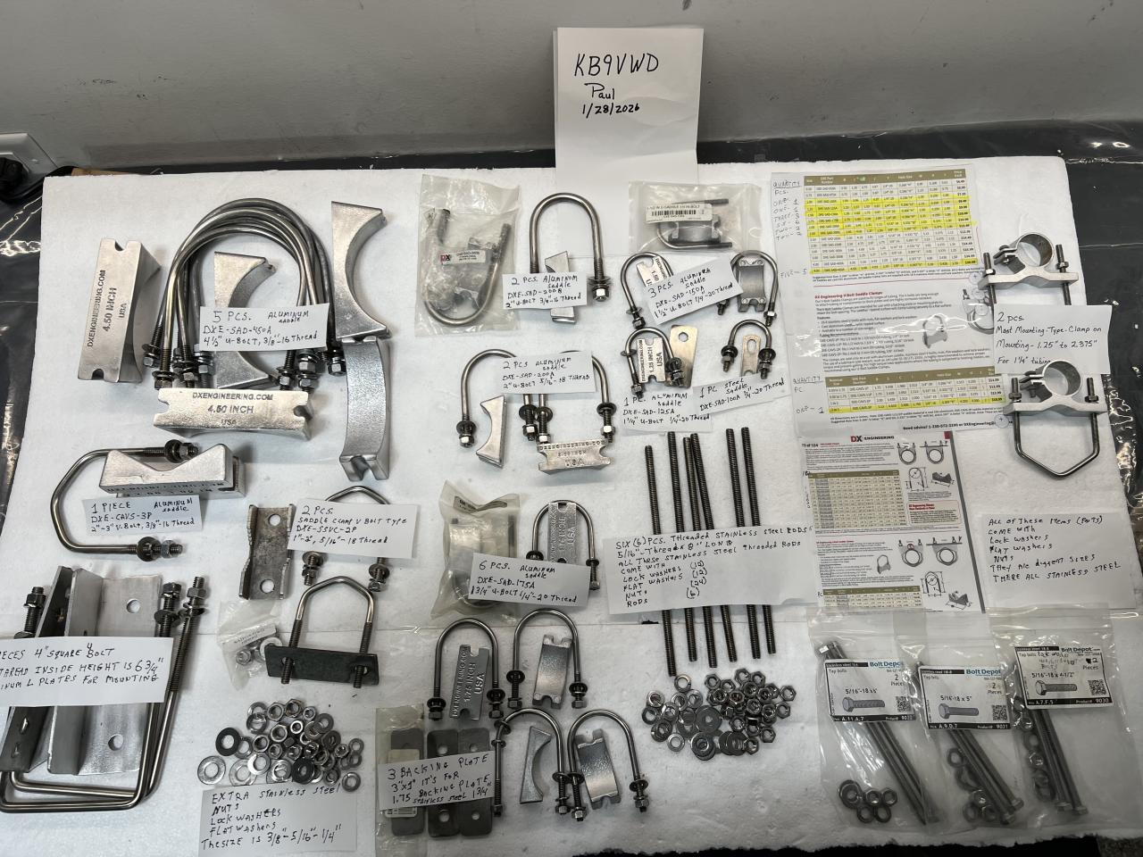 DXENGINEERING sell & have descriptions on U-Bolts and V Bolts and everything in the picture. All these items in the picture are from DXENGINEERING when you look at the picture it gives you the number of pieces and the part number (most of the parts has the alphabets and the numbers on it) and a the description of sizes (all sides) and the price of new saddle clamps it’s on the picture on the right side of the picture I will not separate these parts. The sale price for all parts is $320.00 OBO.