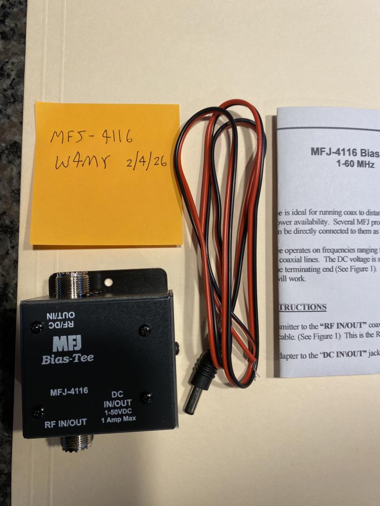 *****SOLD PENDING FUNDS***** For Sale MFJ-4116 Bias-T for injecting and extracting DC voltage into a coax line to power remote devices. This one works in applications for 1 - 60 MHz. $25 plus $13 flat rate shipping to USA. I have two. Money order, check, or cash only please. 73 Marty W4MY