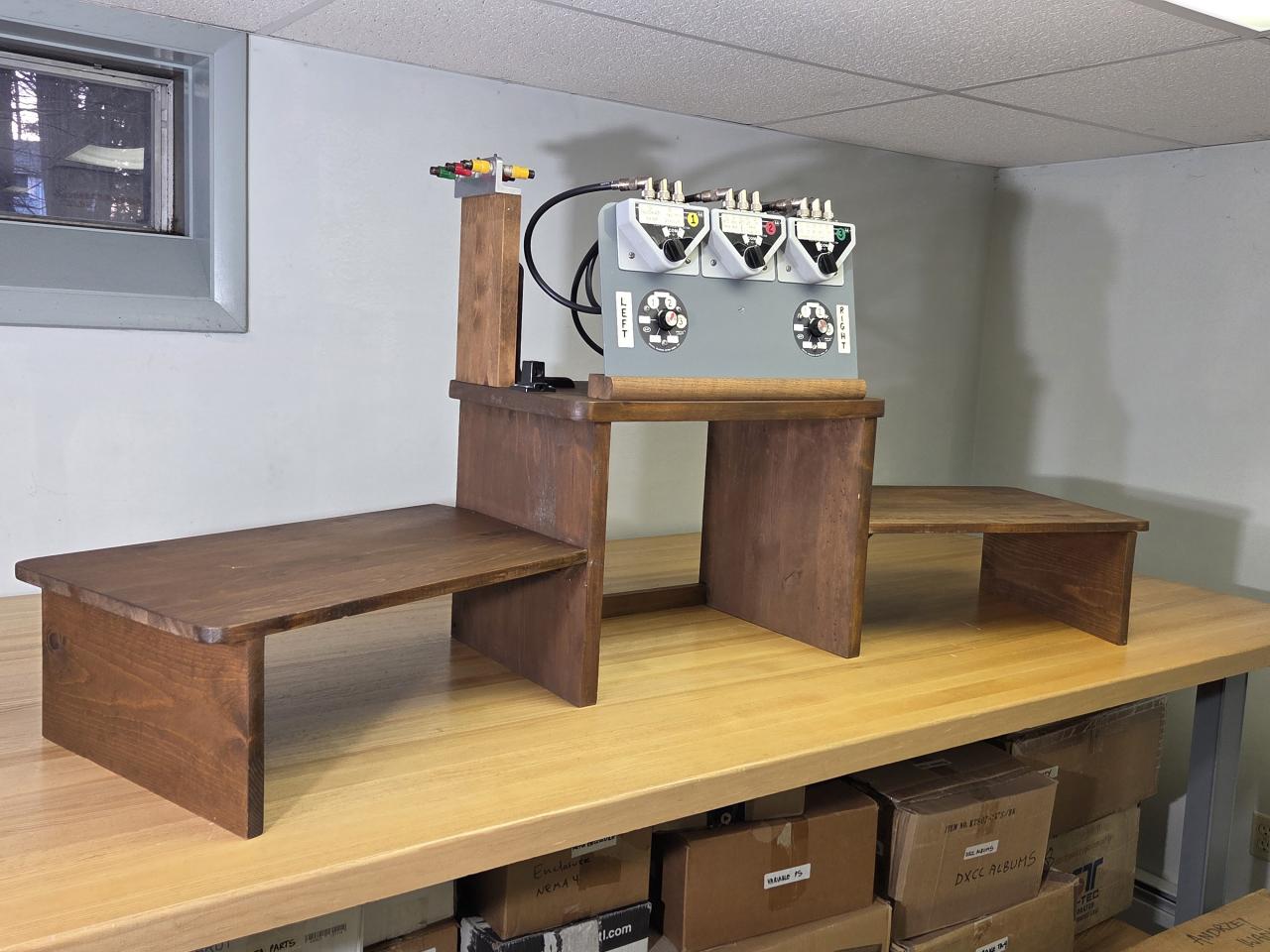 This desk includes a 2x6 SO2R (or multi-single) switching setup. This allows sharing of 6 antennas between 2 radios. Each of these switches selects one of 2 antennas with a center grounding position. There are 3 unused positions on each of the B&W switches which can be used for additional antennas.