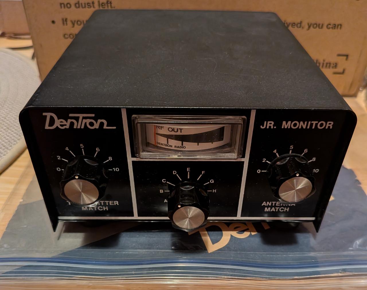 Dentron Jr Monitor tuner. Tunes coax, long wire and balanced feedline 160-10 meters. 300 watt rated so very conservative for contemporary 100 watt HF rigs. In very good condition for its age and works well. Includes original factory manual. Some light marks and oxidation on real panel but interior is very clean. Minor marks on cabinet. Inductor switch is tight and so are the rear panel SO-239 connectors. Overall, one of the cleaner Jrs you'll find. $69 double-box shipped to CONUS.