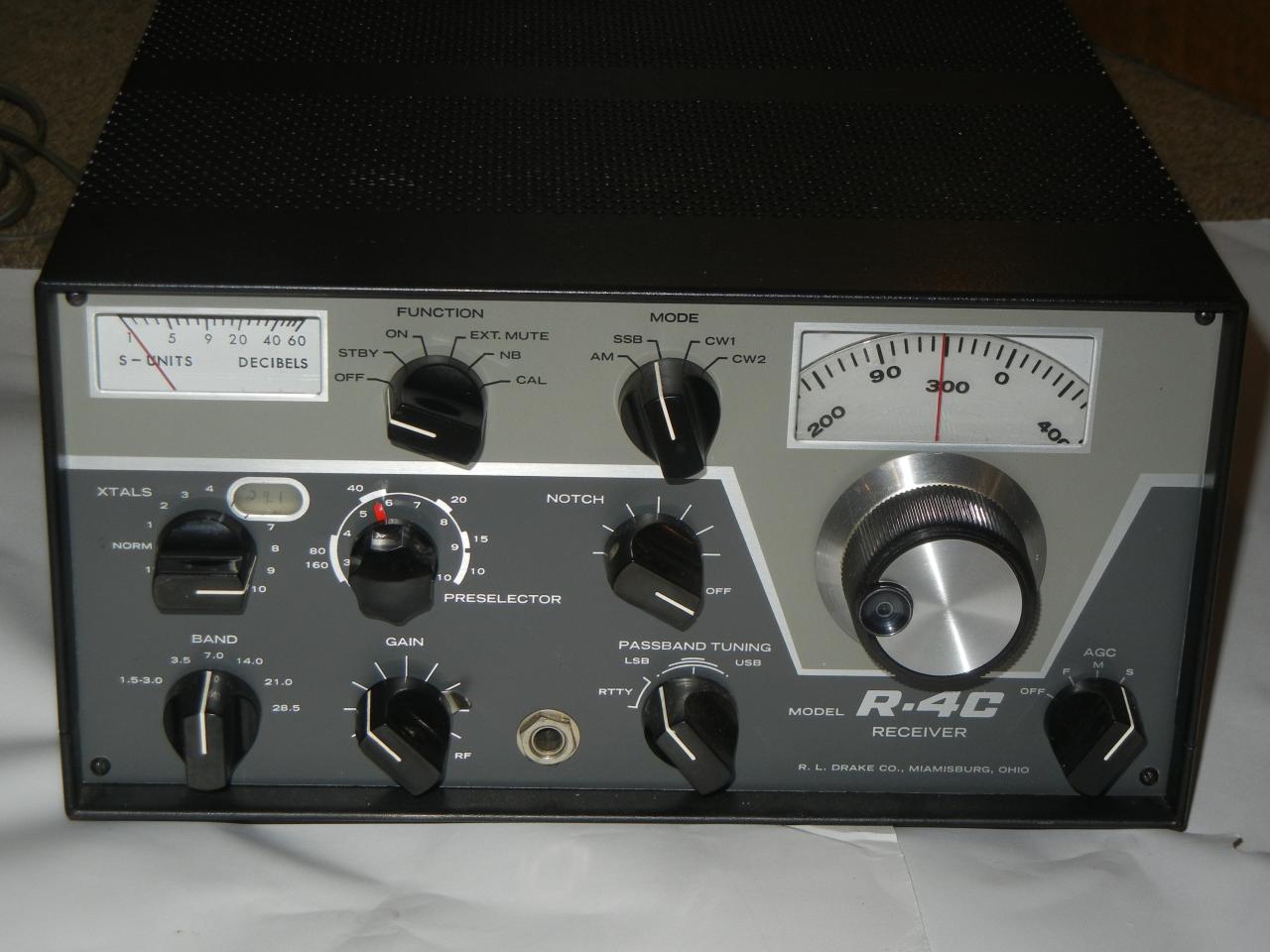 Drake R-4C receiver. Fully functional and in great condition. Has the optional 1.5 KHZ, .5 KHZ(CW) and 6 KHZ(AM) filters installed along with the optional noise blanker. Optional crystals for 160M (1.5 MHZ), 30M & WWV (10.0 MHZ), WWV (15.0 MHZ), 17M (18.0 MHZ), 28 MHZ, 29.0 MHZ and 29.5 MHZ. Sherwood mods installed: filter cap mod; audio amp mod; and power supply replacement. Original manual included. S/N 17821.