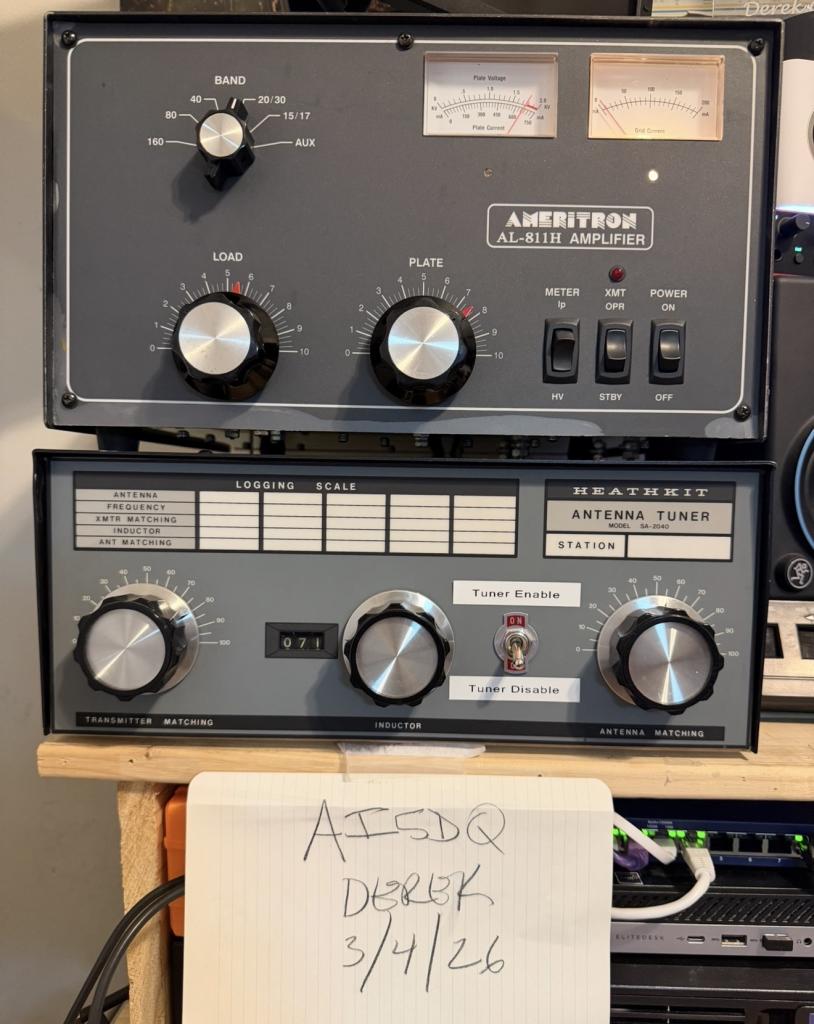 Ameritron 811H amplifier with grounded grid mod, 4 generic tubes producing approximately 500w with 60w drive on 20-80m. 400w on 10m. One meter backlight is out. 120v.