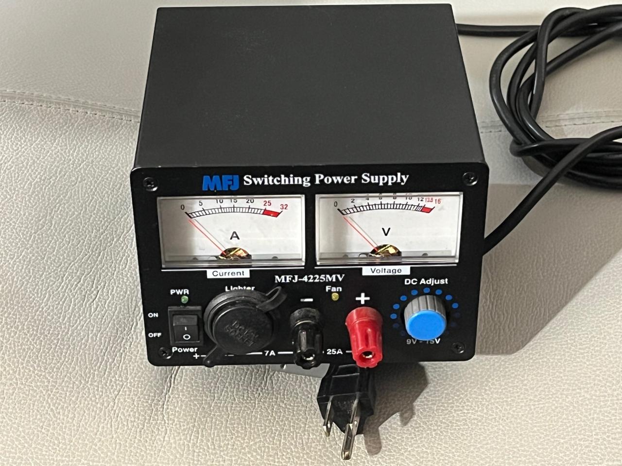 I have available a very good condition MFJ-4225MV power supply. The output is adjustable from 9 to 15 VDC. There are two outputs, one being binding posts, which will give you up to the full 25 amp capability, and a cigarette lighter receptacle, which can give you up to 7 A of output. This is priced at $80 plus shipping in the USA only.