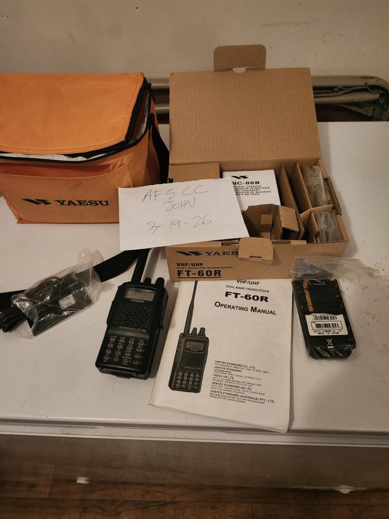 From a SK estate I have for sale a used Yaesu FT60 in excellent condition. Receives and transmits fine, doing 5 watts on both bands, and has wide receive as well. It comes with the wall charger, dualband antenna, NIMH battery (can't guarantee life on this), FBA-25A AA battery case-holds 6 AA batteries, E-DC-6 DC power cable in case you want to run it off of a power supply or cigarette lighter plug, original manual, and original box. Also comes with a nylon Yaesu Carry case for all of this.