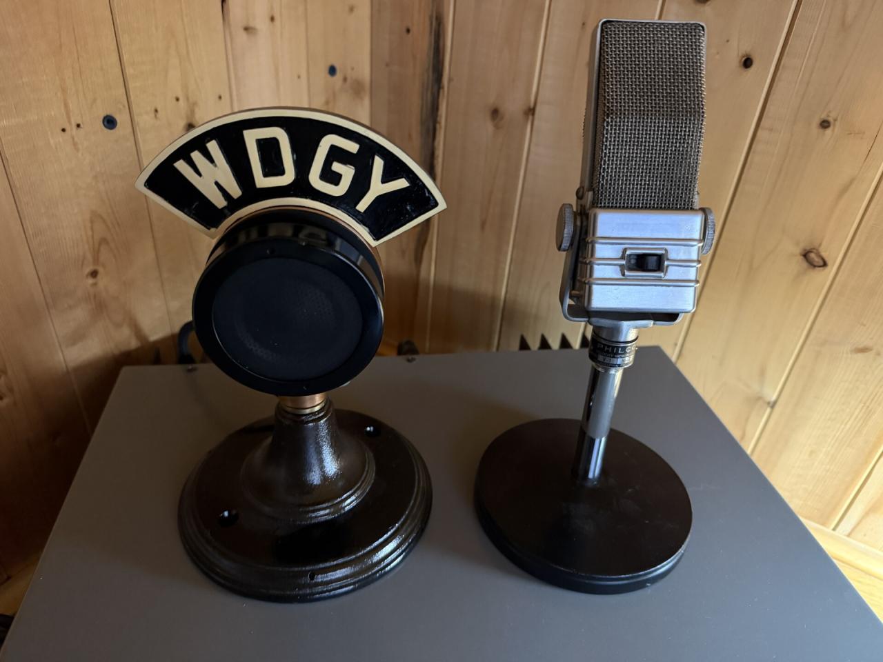 Western Electric 618A mic "WDGY" badge. ( this radio station is still on the air ) ... has been restored to a very high degree. Works beautiful. 800.00. The second one is a Philco V-1 ribbon mic. Beautiful condition, also working. 400.00. Check or money order only. Local pickup always welcome too. Thanks.