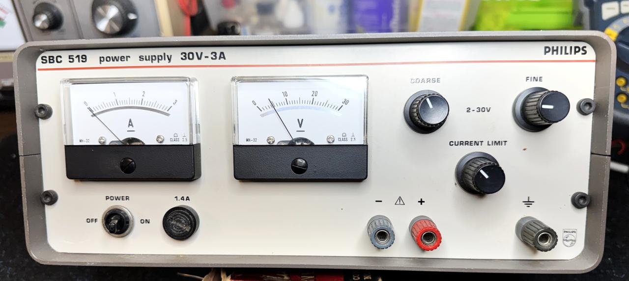 Philips SBC 519, 2-30VDC at 3A. Tests fine, excellent condition other than apparently missing a bail. Each side has a bolt hole located where a bail would be attached. Many more photos are available if you send your email address.