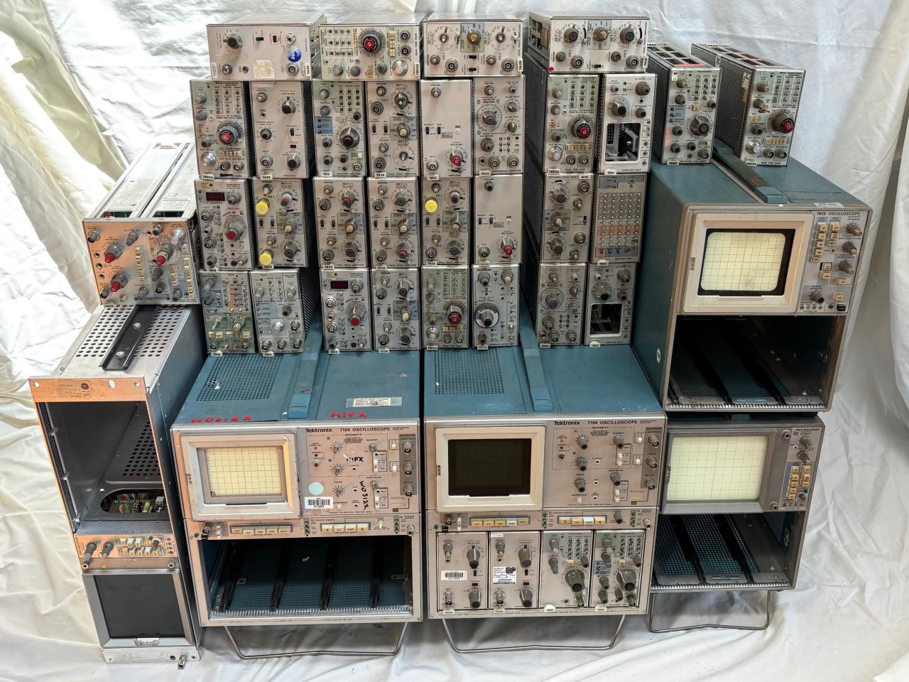 For $250 you get 1 7104 with a complete set of the correct plug-ins, I last used this scope about 5 years ago, the power supply ticks (in shutdown mode). A second complete 7104 (missing knobs) for spares, a spare power supply + a box full of spare boards and interconnects for a 7104. A working R7603, a 7603 missing its power supply but you also get a tote full of LV and HV spare power supplies, a 7613. Thirty two 7000 series plug-ins 7S14, 7S11 (2), 7T11A, 7A26 (8), 7B53A (5) and many others. If you would like more pictures, please ask. Cash only. You must take it all. I live in Fernandina Beach, Florida.