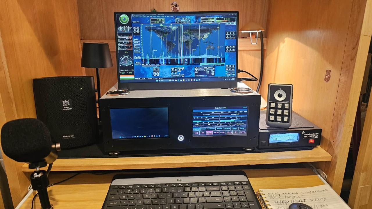 Here is one of the neatest radios I have ever owned, home brewed one of a kind. Here is your chance to have a full 1KW Radio all built in one box. Consist of a VK3AMP 1 KW Amp, with the Hermes Lite 2+ with pure signal, and a mini Windows computer. Two 7" monitors, left for the Windows program, the right for the Amplifier, and a separate 10 inch touch screen monitor for Thetis. Always get great audio reports from the unit. Covers from 10 to 160 Mhz.