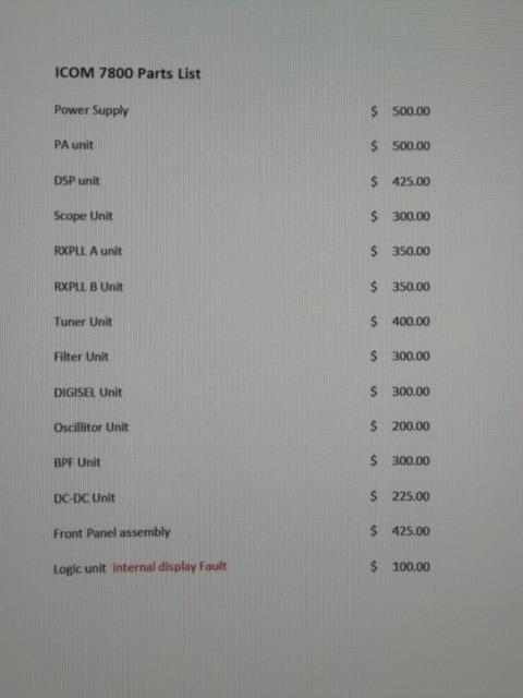 I am sadly parting out my ICOM IC-7800 I have attached a list with prices which includes shipping with tracking for USA and Canada US Order may also require Duties at 10%