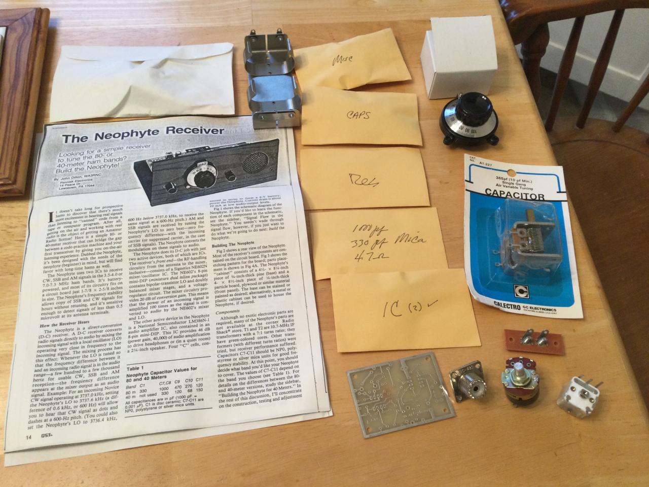 Back in Feb 1988, there was a QST construction article for the Neophyte Receiver written by WA3RNC. It was a simple 2 IC receiver using an NE602 AN mixer and LM 386 IC for audio amplification. You could build it for either 80 or 40 meter reception. A kit was offered with PCB and all required parts and connectors, you furnished the case and front panel. I ordered the kit, built it successfully and still have it. Now 37 years later I have come upon an unbuilt kit of all required parts to build this same receiver. All parts(except cabinet) are in a large plastic bag, including schematic, parts list and a copy of the original article from QST. I have inventoried the contents, confirmed all parts are present, including PCB, brand new vernier dial, if transformers, brand new 365 pf tuning cap, sealed packets containing IC’c, resistors, capacitors , antenna connector and audio pot. Even a speaker and battery holder. $35 plus shipping , PayPal preferred, 73 Bill W9VC