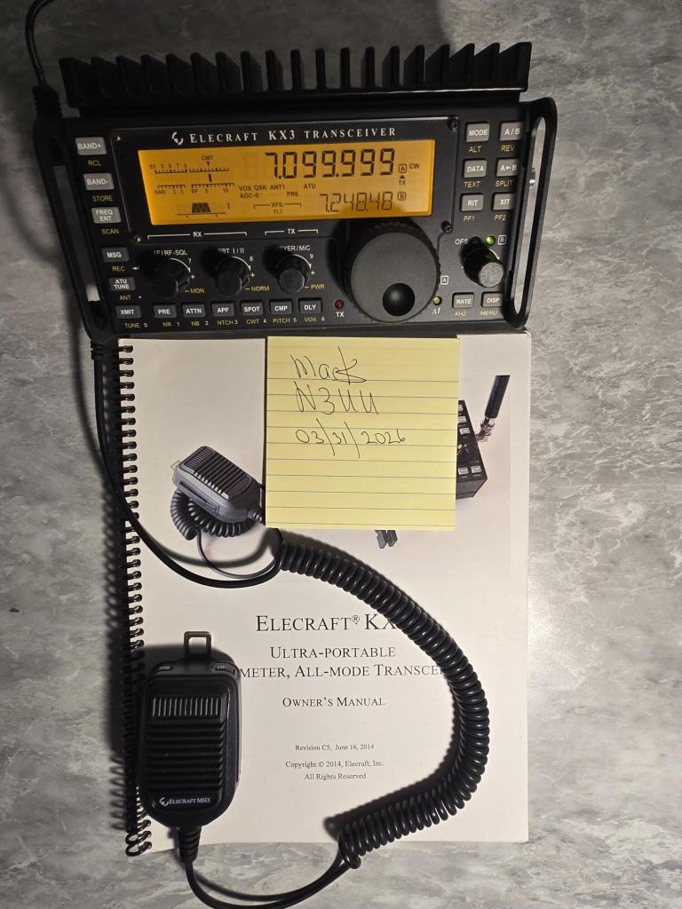 KX3, KXFL3 roofing filter, the KXAT3 internal ATU, the KXBC3 internal battery charger and real-time clock, and it has the newer ball-bearing VFO A encoder. It also has an aftermarket heatsink with fins and aftermarket side panels for a cover. See pictures for additional extra parts & accessories and two power cords included. Unit never used outdoors, in house only.