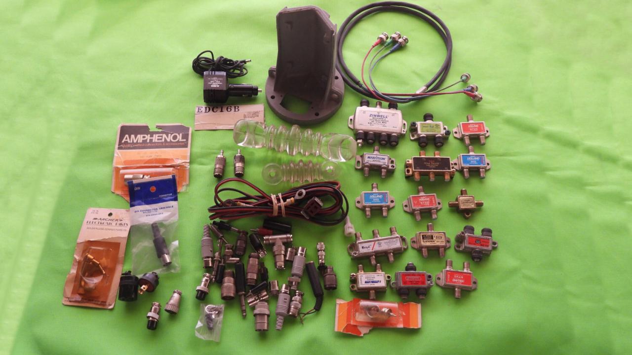 Coax adapters, Pyrex insulators, HyGain/CDE rotor lower mast bracket,
