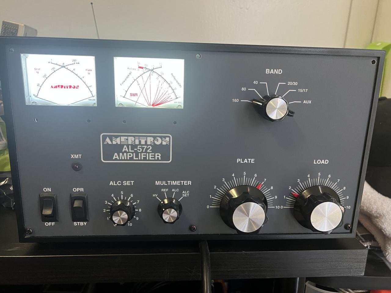 Barely used Ameritron AL-572 amplifier. Like new. Puts full 1300 watts out. The photos include a picture of the meter in the HV (High Voltage) setting. This amp is in pristine condition.